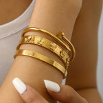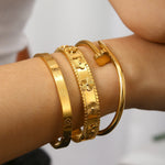 Elevate your everyday elegance with this stunning Aurelia 18K Lucky Flower Gold-Plated Bangle Set, beautifully detailed with delicate lucky flower motifs symbolizing charm, positivity, and timeless femininity. Crafted with a luxurious 18K gold finish, Aurelia offers a radiant shine and premium feel, perfect for stacking or wearing solo. Its versatile, fashion-forward design makes it an essential accessory for casual outfits, special occasions, or as a gift for someone special. Add a touch of refined sparkle to your jewelry collection with this must-have statement piece.